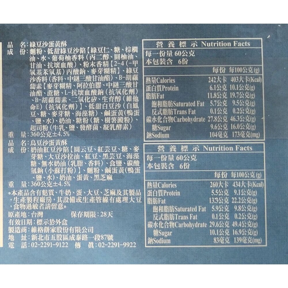 成份:麵粉、綠豆沙餡【綠豆仁、海藻糖、特砂糖、大豆沙拉油、無水奶油、葡萄柚香料(丙二醇、圓柚油、甘油、抗壞血酸)、綠豆沙香料、(丙二醇、複方香料)、水、β-胡蘿蔔素【麥芽糊精、阿拉伯膠、中鏈三酸甘油酯、蔗糖、L-抗壞血酸鈉(抗氧化劑)、β-胡蘿蔔素、二氧化矽、生育醇(維他命E)(抗氧化劑)】、白豆沙(白鳳豆、糖、麥芽糖、海藻糖)、鹹蛋黃(鴨蛋、鹽、水)、奶油、糖粉(糖、樹薯澱粉)、起司粉(牛乳、鹽、發酵菌、凝乳酵素)