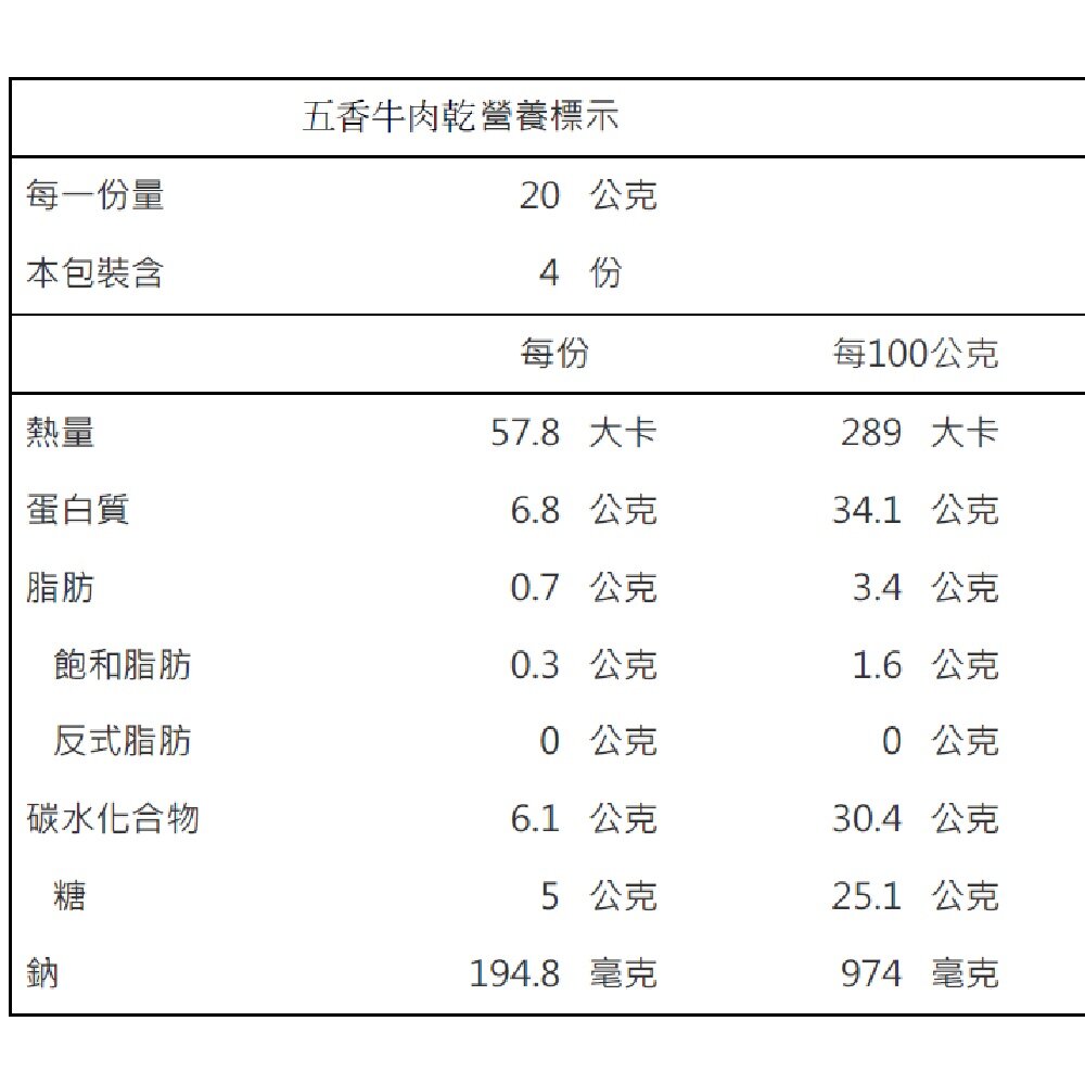 成份:精選牛肉、砂糖、醬油、魚露、食鹽、胡椒粉、薑母、甘草粉、花椒、大茴、品質改良劑(甘油、醋酸鈉、DL-蘋果酸)、食用黃色五號