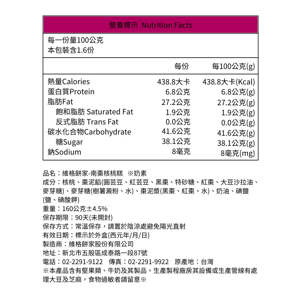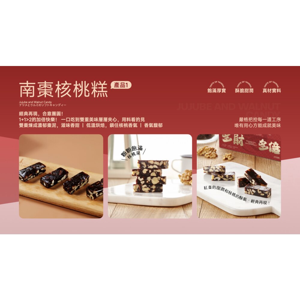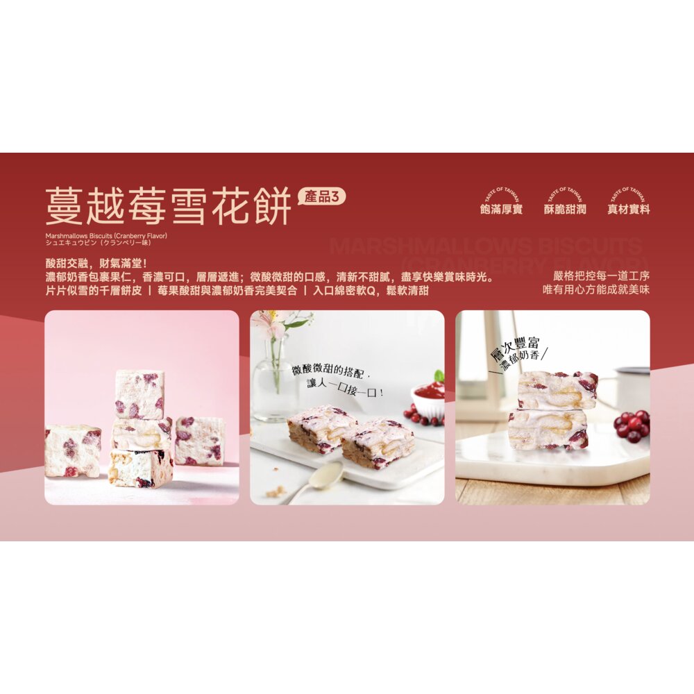 保 存 期 限:南棗核桃糕、杏仁牛軋糖90天;蔓越莓雪花餅300天(依外盒日期為主)