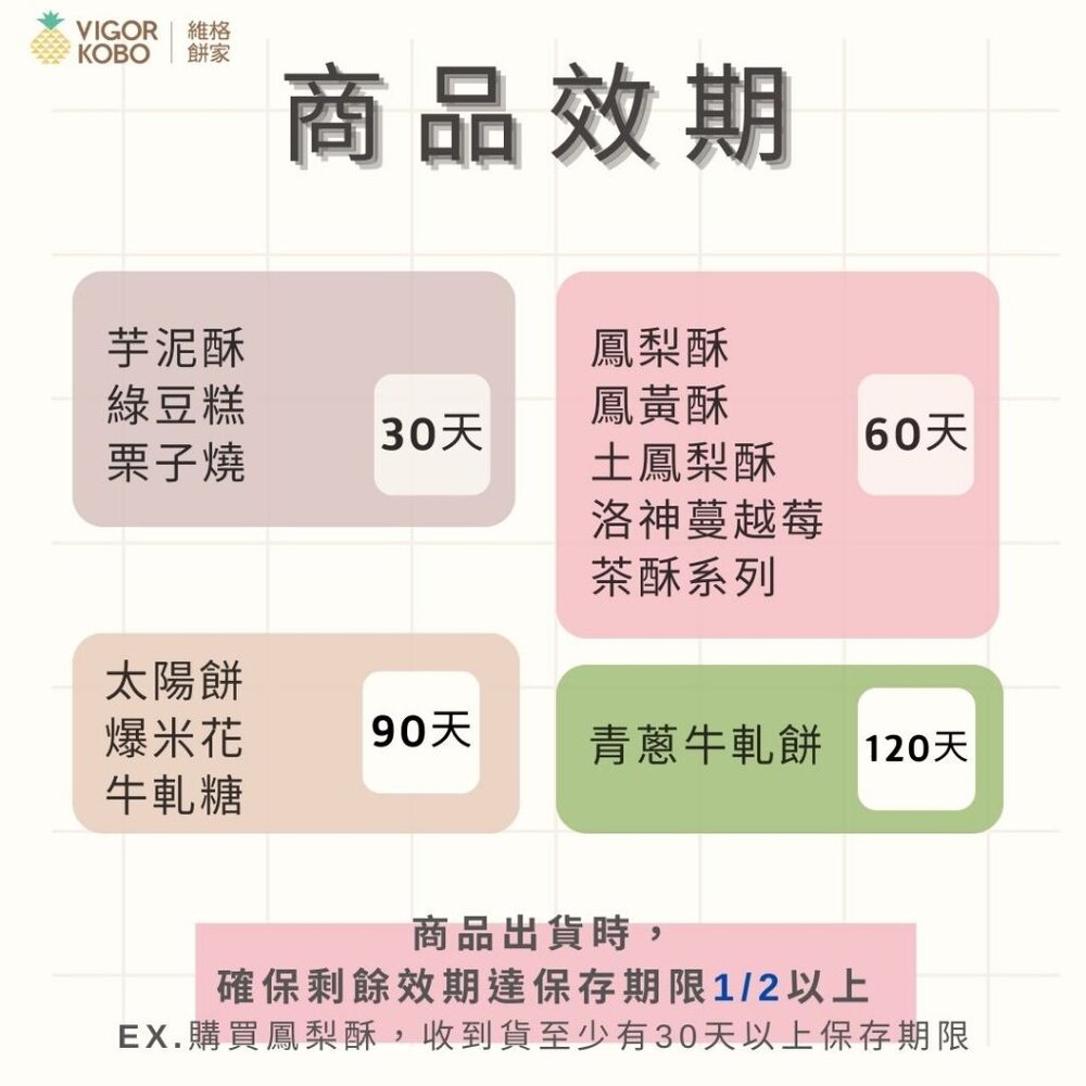 *商品出貨時,確保剩餘效期達保存期限1/2以上*